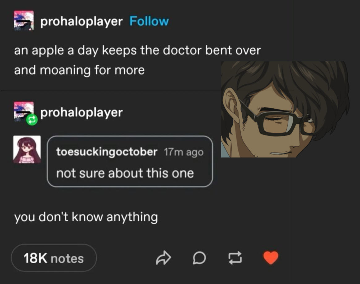 oh and finally, just some more contrived porno set ups. love the idea of being able to go icly "i've seen this in a porno!" and then the characters still fuck. it tickles me. but also, i play a irredeemable pervert so.